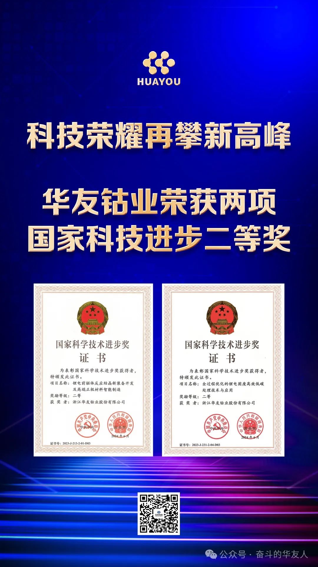 6月24日,2023年度國家科技獎(jiǎng)勵(lì)獲獎(jiǎng)情況揭曉,中國科學(xué)院過程工程研究所主導(dǎo)、華友參與的2項(xiàng)科研成果——“鋰電前驅(qū)體反應(yīng)結(jié)晶新裝備開發(fā)及高端正極材料智能制造”、“全過程優(yōu)化的鋰電固廢高效低碳處理技術(shù)與應(yīng)用”榮獲2023年度國家科學(xué)技術(shù)進(jìn)步二等獎(jiǎng),標(biāo)志著華友在有色金屬綠色精煉、鋰電材料開發(fā)、資源循環(huán)再生利用領(lǐng)域創(chuàng)新成果再攀新高峰,彰顯了華友在新能源材料技術(shù)革新與可持續(xù)發(fā)展方面的領(lǐng)先地位。